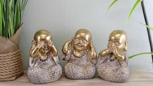 Gold Buddha Ornaments, See No Evil, Hear No Evil, Speak No Evil - Set of 3